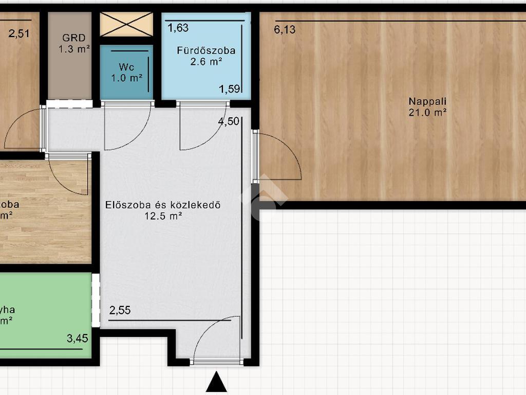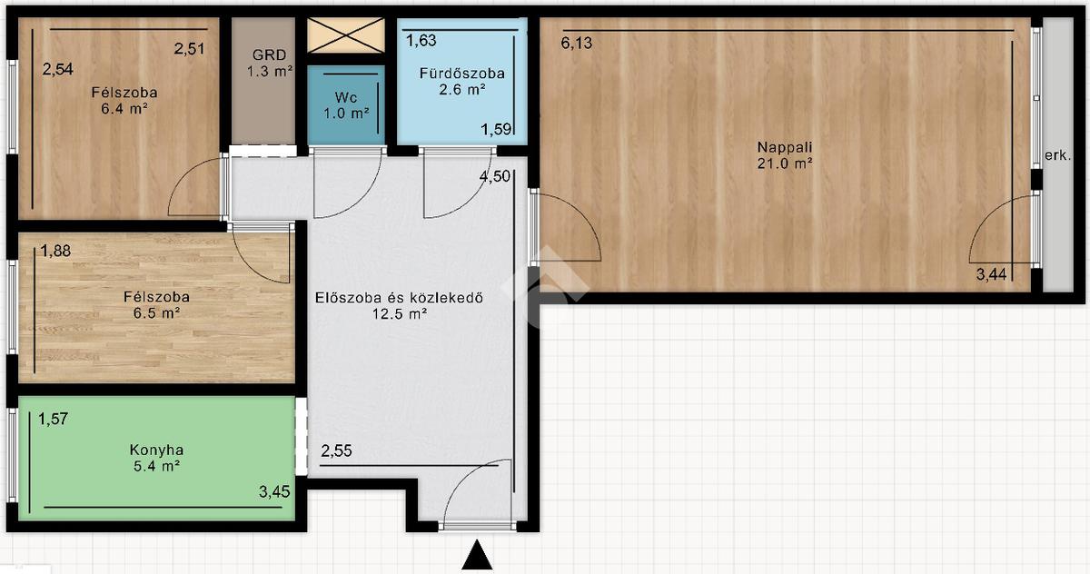 A szobákban laminált parketta található, míg a konyha, közlekedő és vizeshelyiségek járólappal burkoltak.